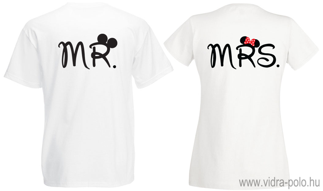 Mrs. és Mr. póló szerelmespároknak, ez a lány változat. A minta a póló hátulján van alapértelmezésből.